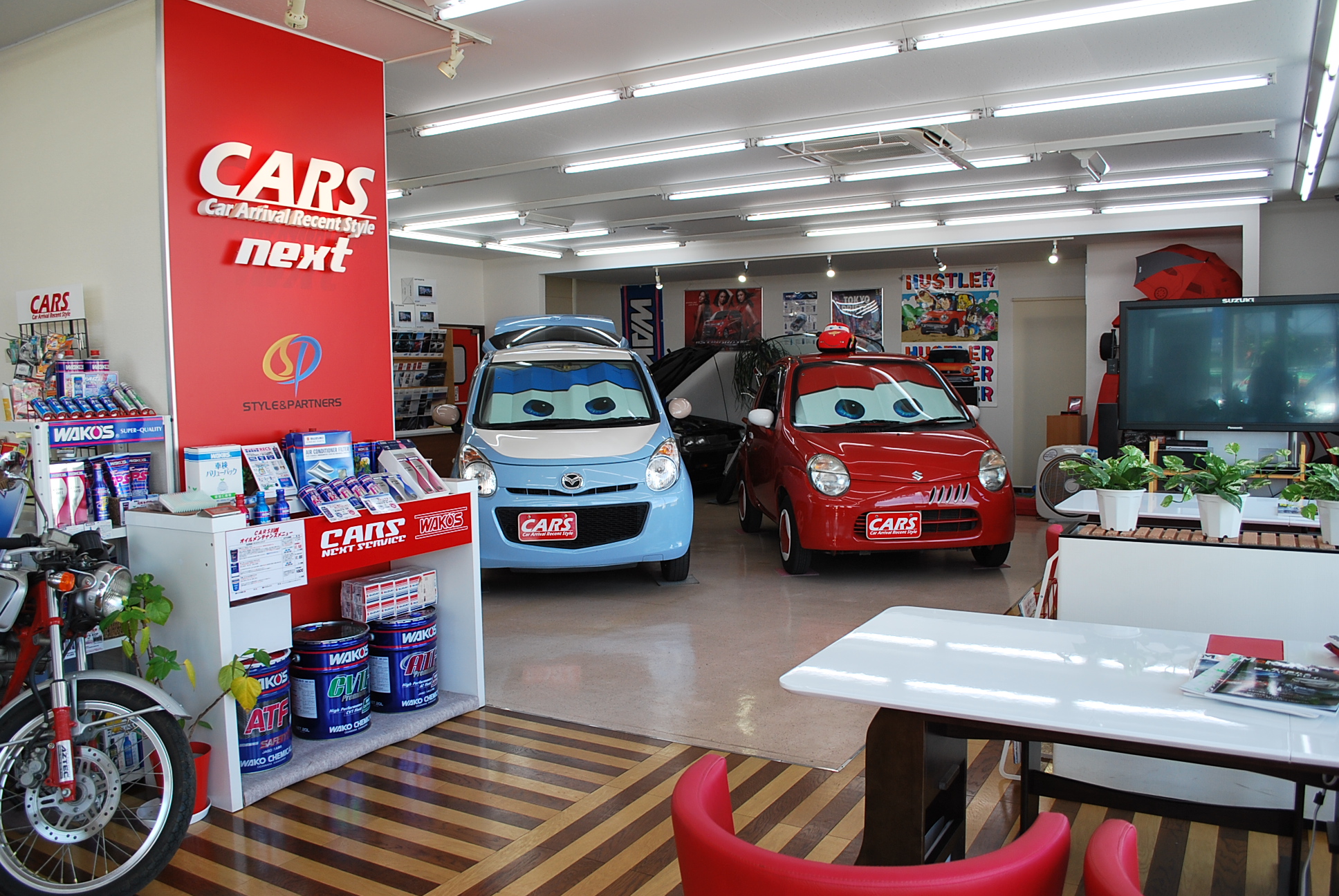 サービス工場・鈑金工場も同敷地内に完備しておりますので、様々なご要望にも出来る限りお応え出来ます。サービスもオイルの質(WAKOSエンジンオイル100%使用)も他社には負けません。