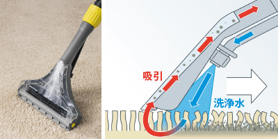 丸洗い出来ないシートやカーペットは洗浄剤入りの水で洗いながら汚れを吸引します。
