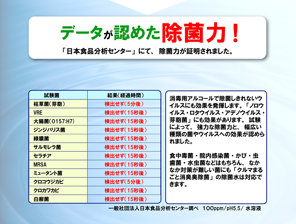 除菌=「アルコール」では死なない強力な感染力を持つ「ノロウイルス・ロタウイルス・アデノウイルス・芽胞菌」にも効果があります。除菌効果の試験によって、強力な除菌力と、幅広い種類の菌やコロナウイルスへの効果が認められました。食中毒菌・院内感染菌・かび・虫歯菌・水虫菌などはもちろん、なかなか対策が難しい菌にも対応します。