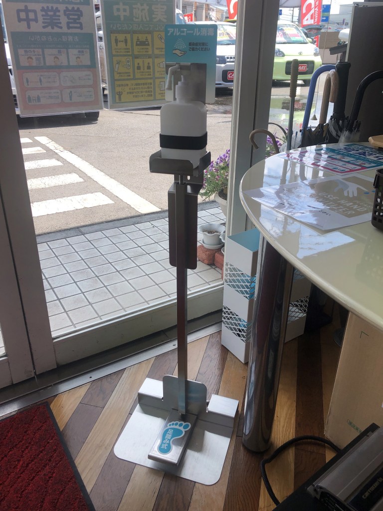 まずは店内へ入ってすぐ左手にあるアルコール消毒液です。先日、足ふみポンプスタンドを新たに設置したので、より手で触れる場所が少なくスムーズに消毒していただけます。